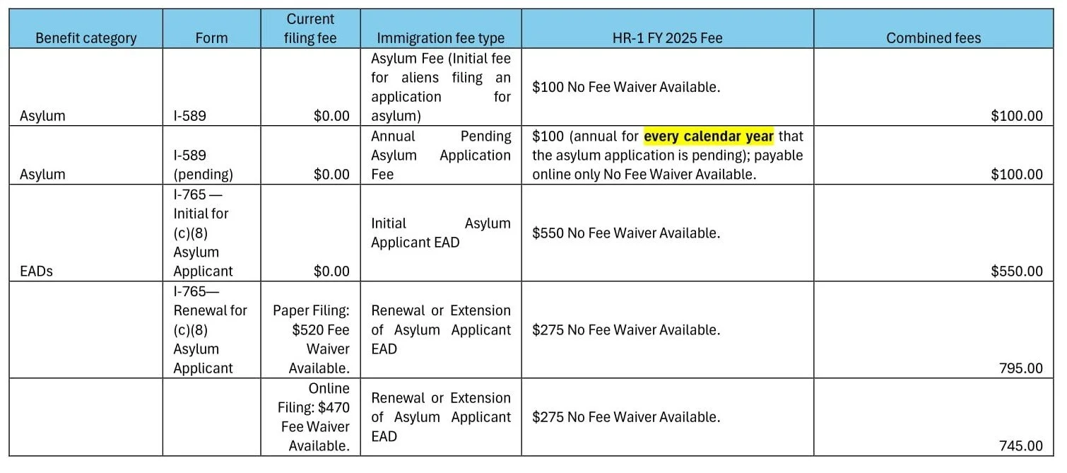 For example: For Asylum filing case, there is no previous filing (initial fee) but it has changed to $100 filing fee with no fee waiver is available. In addition to the initial filing fee, if the asylum case is pending, the applicant must pay $100 annually.